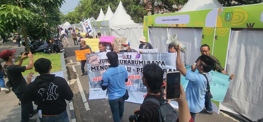 SUKABUMITREN.COM - Puluhan jurnalis yang tergabung dalam Ikatan Jurnalis Televisi Indonesia (IJTI), Persatuan Wartawan Indonesia (PWI), dan Aliansi Jurnalis Indonesia (AJI) berunjuk rasa di depan Gedung DPRD Kota Sukabumi, Rabu, 22 Mei 2024. Aksi unjuk rasa itu dilakukan sebagai wujud penolakan terhadap RUU Penyiaran, yang dinilai mengancam kebebasan pers di Tanah Air.